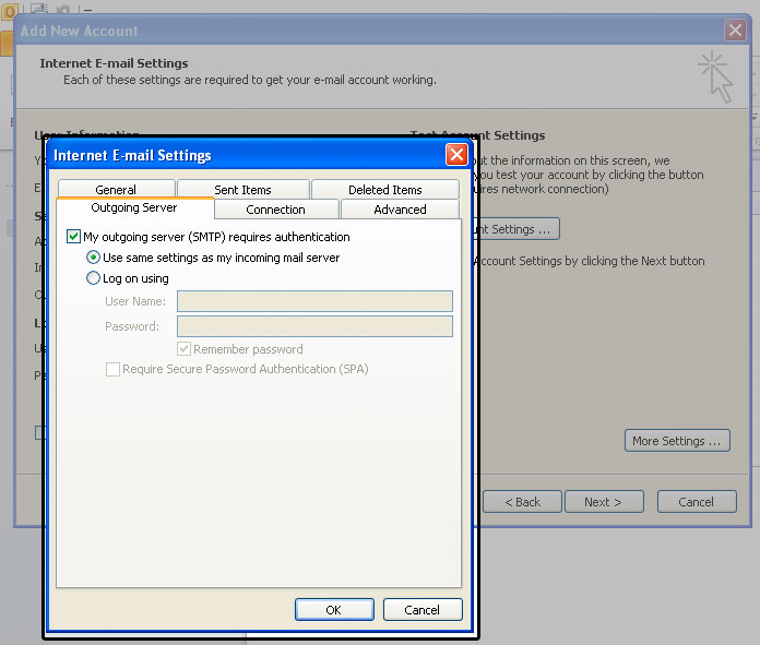 - Click on the Outgoing Server tab. Check My outgoing server (SMTP) Requires Authentication. Make sure Use same setting as my incoming mail server is also checked. Click on OK. See Figure 6 as reference.