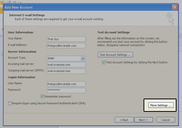 - Enter mail.example.com in the Outgoing mail (SMTP) server: field. To avoid common authentication issues with Outlook, we strongly advise using SSL and port 465 for SMTP connections.